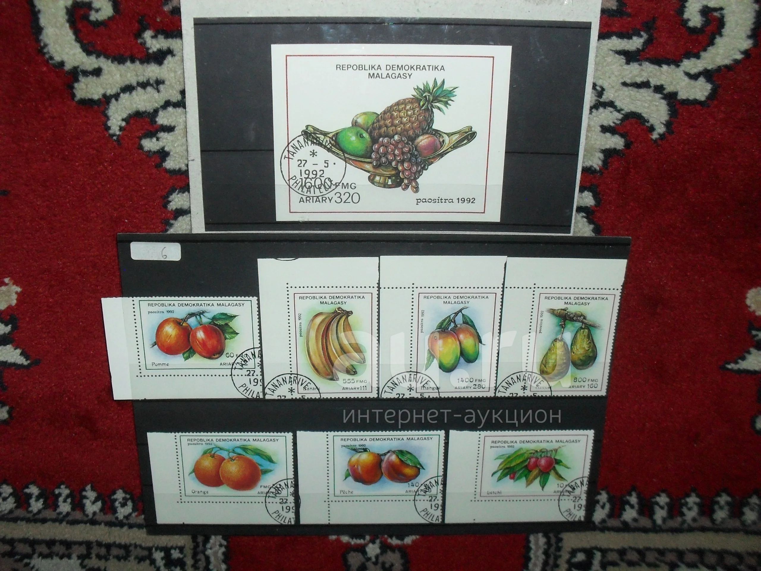 Полная серия из 7 марок и блока Мальгашской республики 1992 г. Флора "Тропические фрукты" в отличном состоянии с угловыми полями от листа.