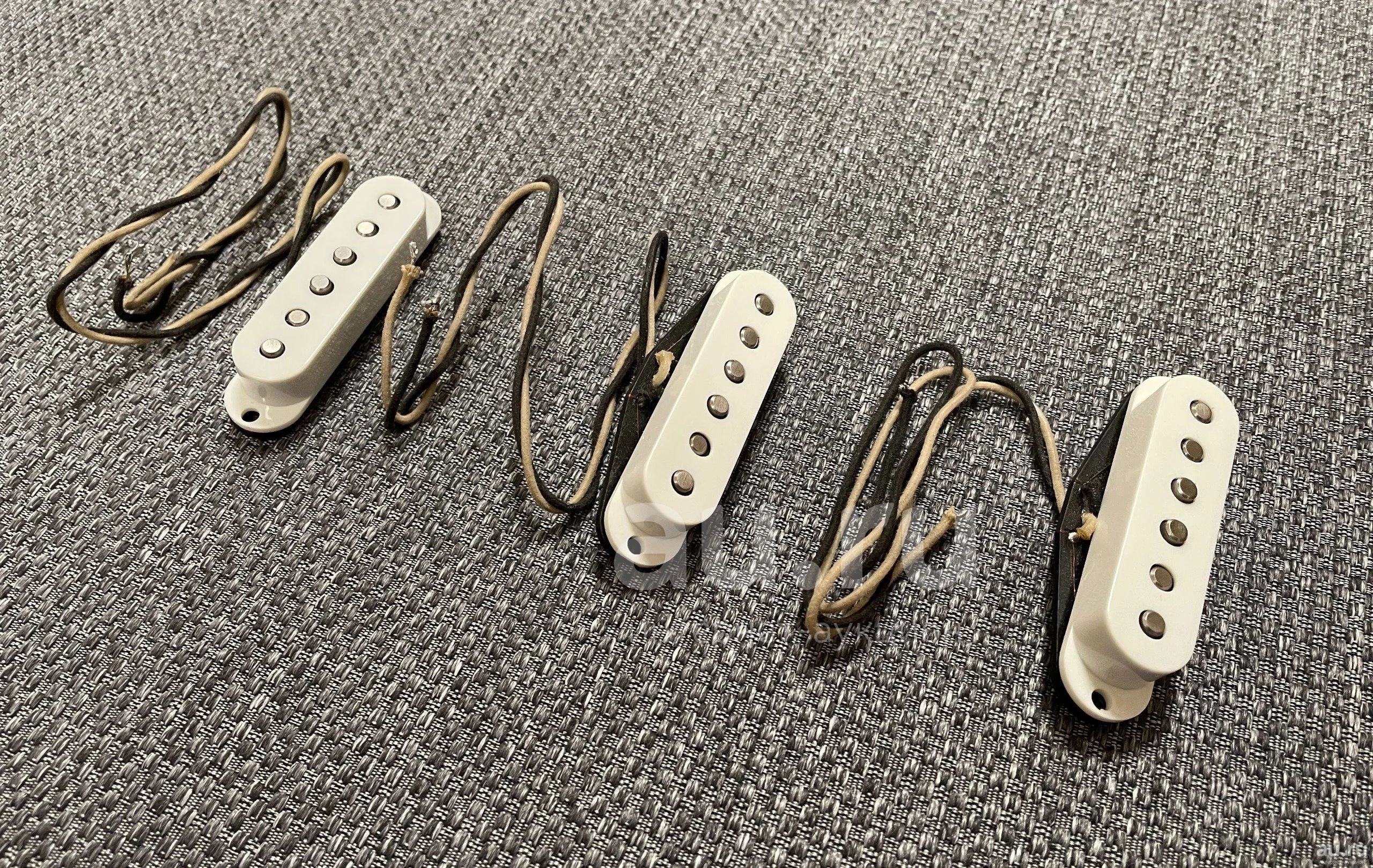 На ютубе масса примеров звучания этих звукоснимателей, настоящий «тот самый» звук. Расстояние между магнитами 52 мм, средний звукосниматель имеет обратную полярность. Сопротивление 5.9 на всех трёх.
