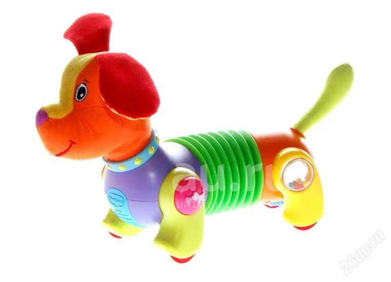 Интерактивный щенок побуждает малыша ползать и ходить. Когда ребёнок дотронется до собачки, она начнёт от него убегать. Через некоторое время щенок остановится, и начнёт призывно лаять или скулить, как бы прося малыша, дотронуться до него снова. Необычная форма тела (гармошка) позволяет собачке путешествовать прямо, по кругу влево и вправо. Есть регулятор громкости. Кнопка с изображением лапы позволяет регулировать скорость движения игрушки.