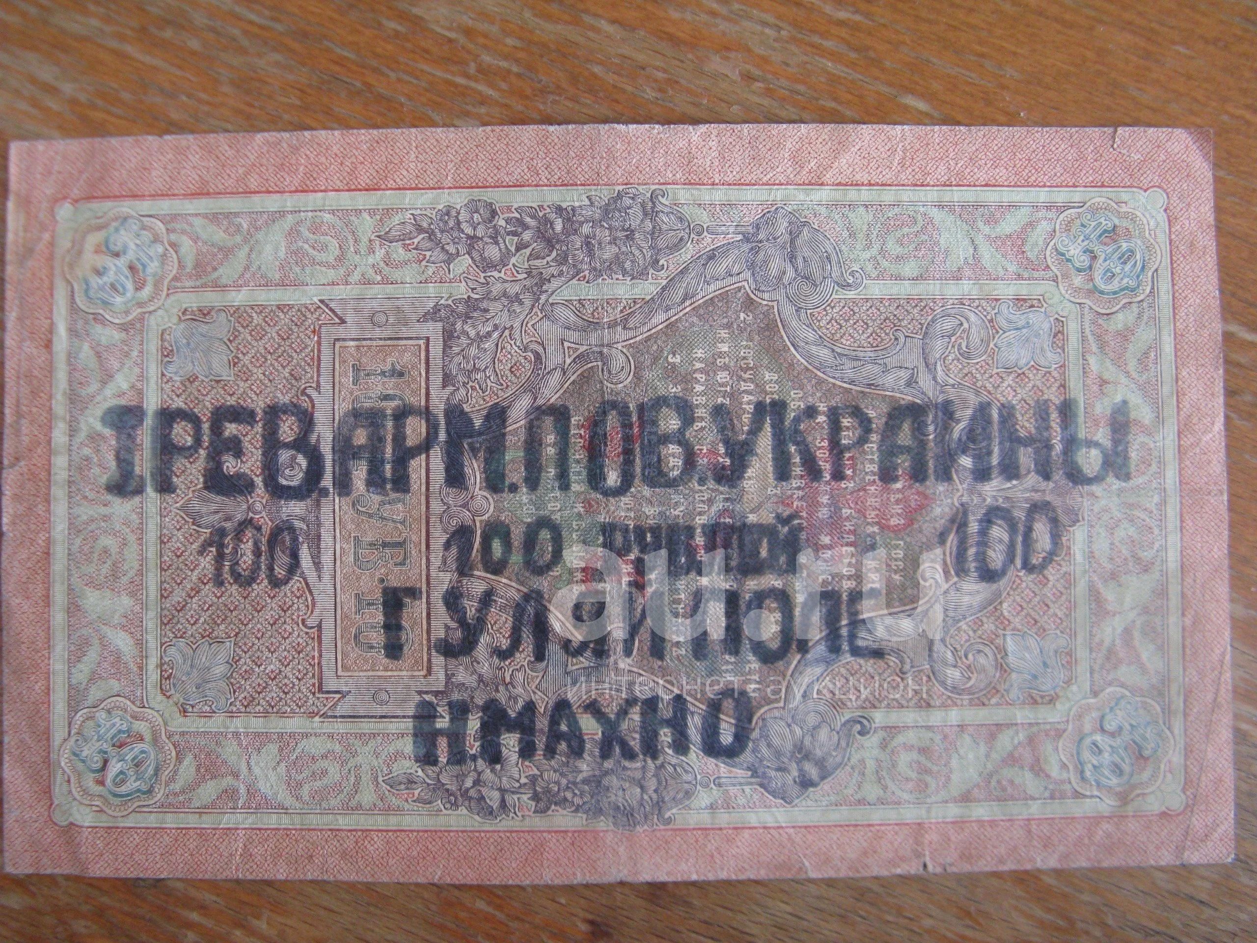 Махно. 100 рублей. Надпечатка на 10 рублях 1909 года. 1 Рев. Армия Пов. Украины. Гуляй Поле. Н. Махно.