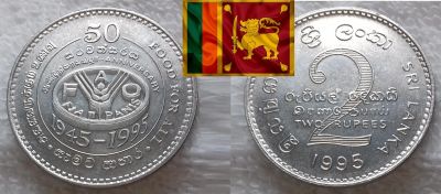 Реверс: В центре – номинал большой цифрой "2", на его фоне – номинал на сингальском языке, ниже – номинал на английском языке: TWO RUPEES. Внизу – год выпуска. По краю монеты полукругом размещено название страны: слева – на сингальском языке, справа – на английском: SRI LANKA.