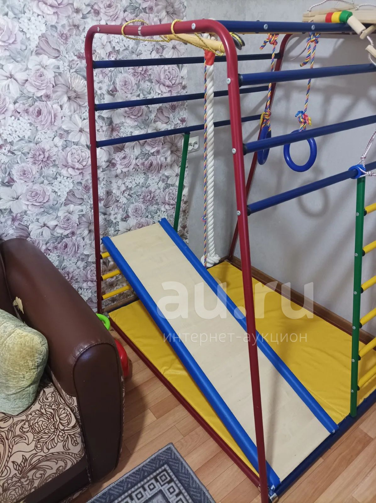 В хорошем состоянии, все крепежные материалы в наличии, комплектация на фото+есть веревочная сетка для лазания (на фото нет, т.к. не устанавливали), потертости на бортиках горки (на фото видно), а так в целом состояние отличное. Сейчас находится в разобранном состоянии.
