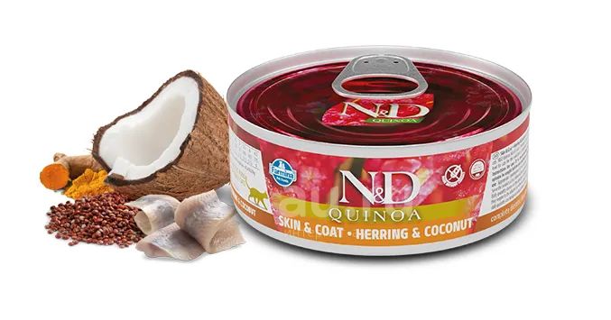 N&D Quinoa Skin & Coat - полнорационный диетический влажный корм для кошек, рекомендуемый для снижения пищевой непереносимости питательных веществ.