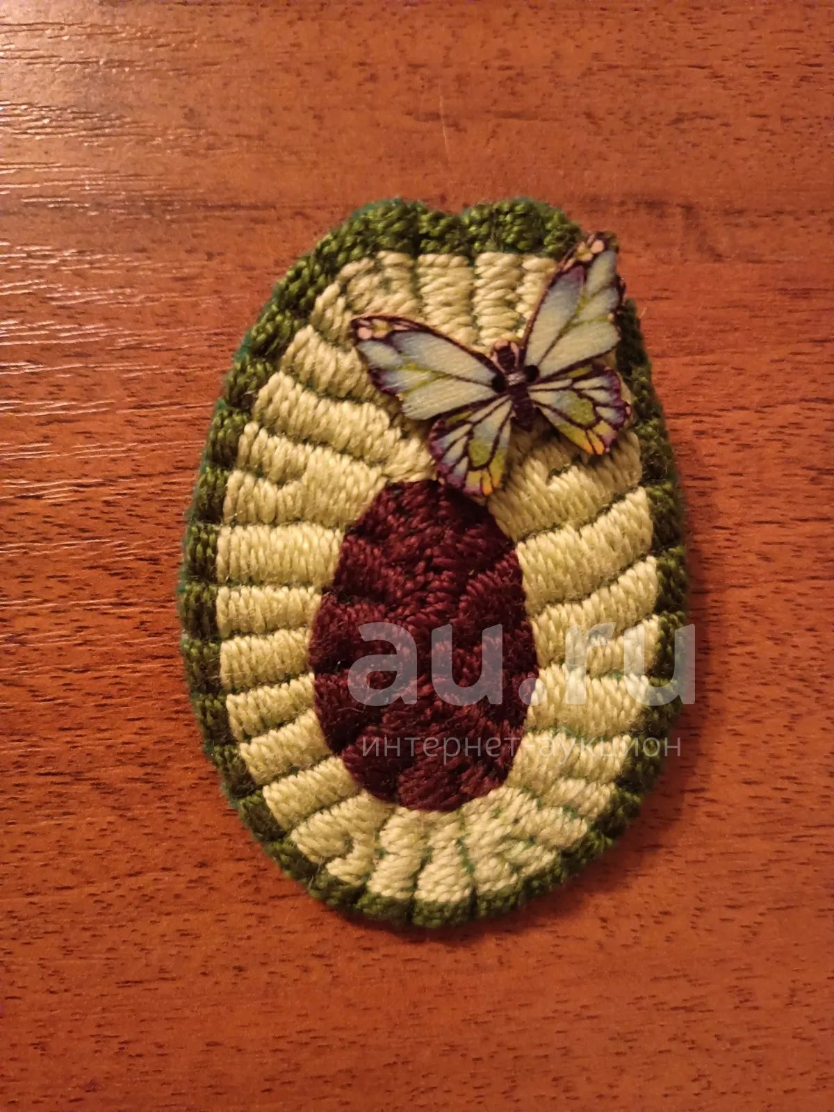 Брошь вышитая в форме авокадо с элементом деревянного декора в виде бабочки.