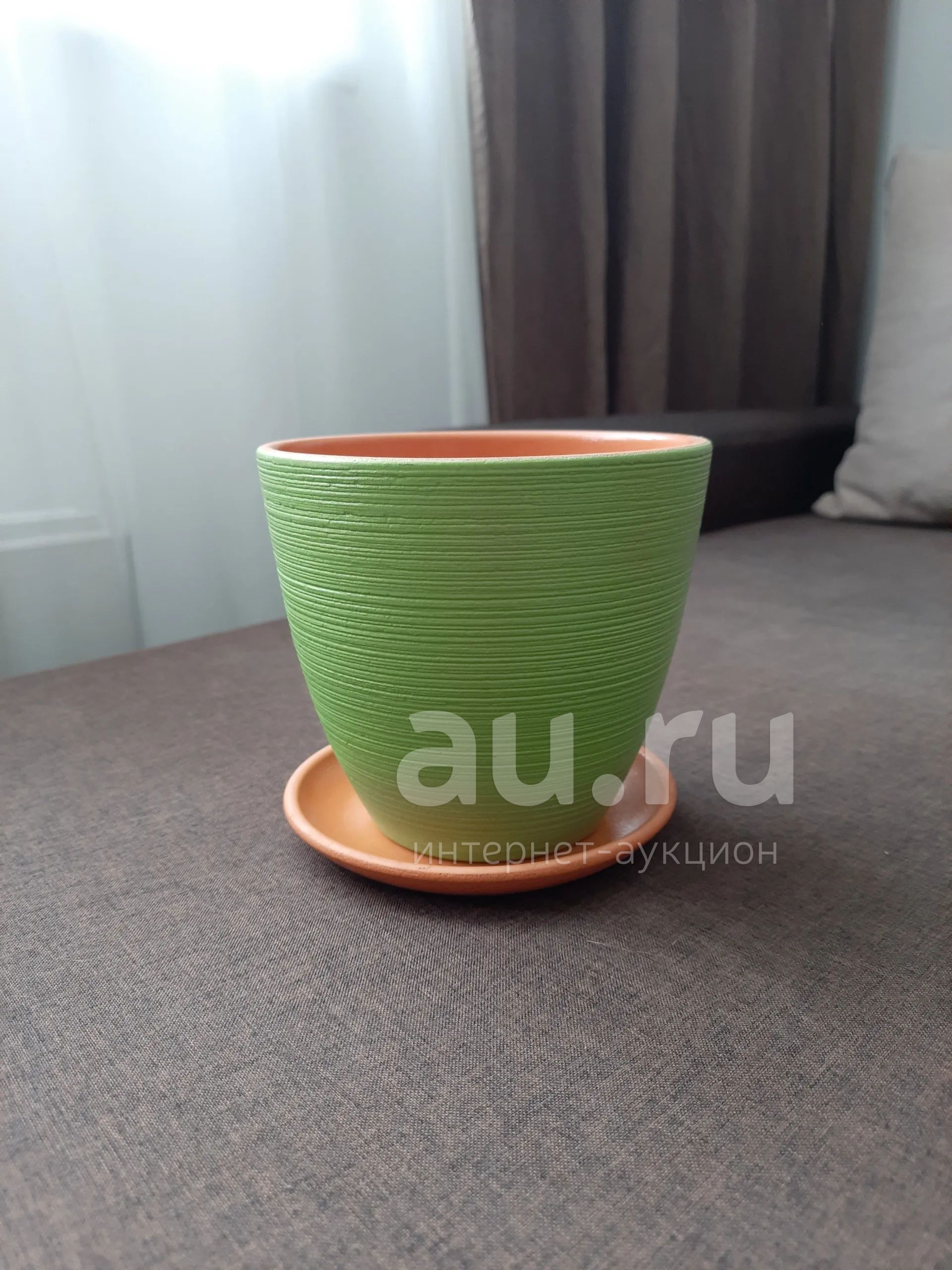С блюдцем, внутри остались следы от земли, так как использовался.