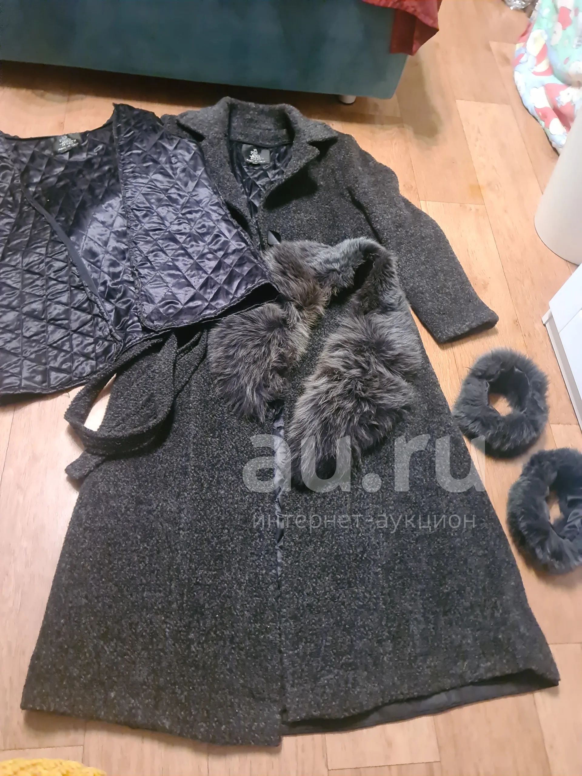 Италия, размер м, есть жилетка на молнии, которая пристёгивается за подклад, есть воротник и меховые рукава на пуговицах.