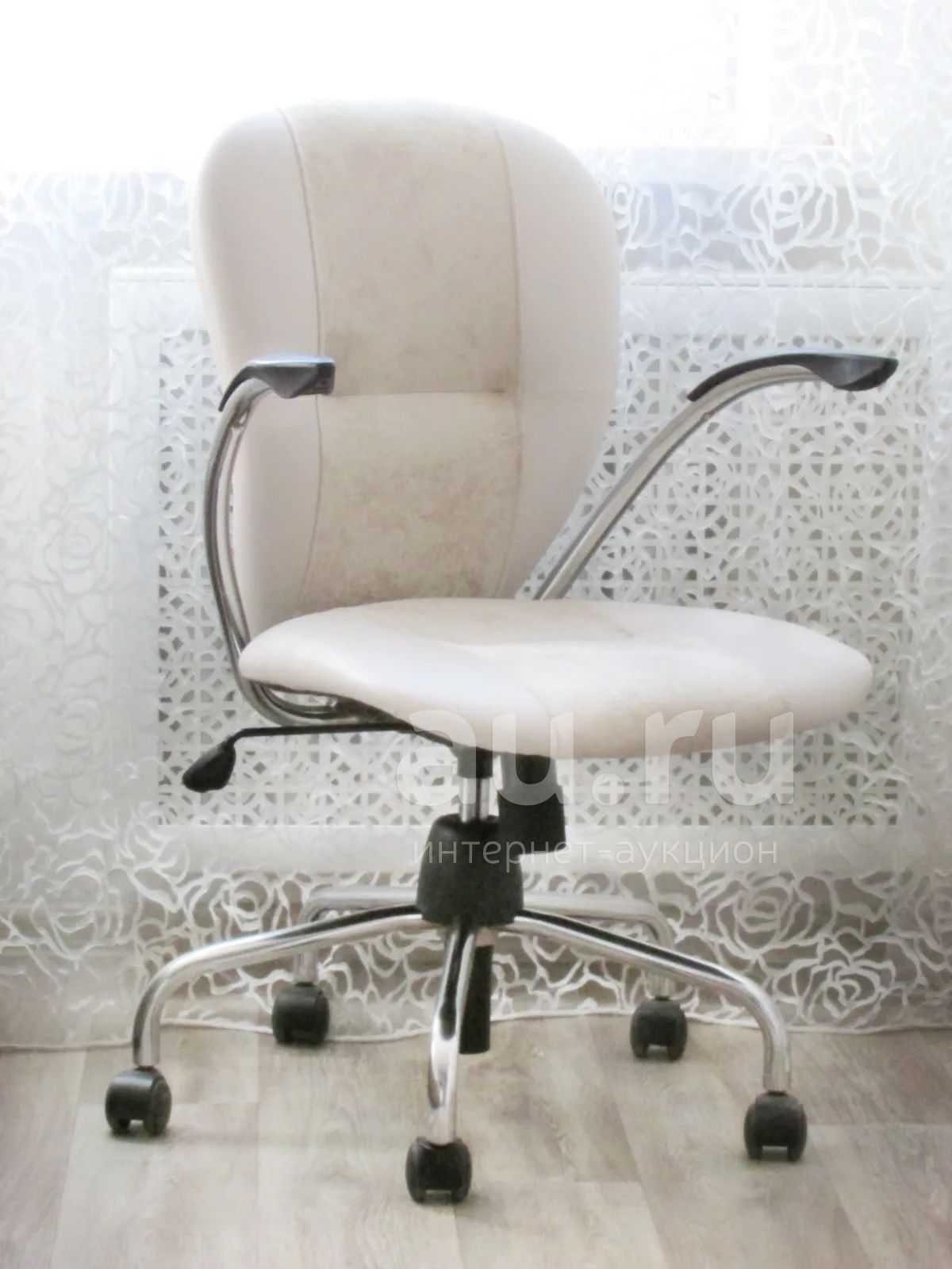 Новая обивка (комбинация велюра бежевого цвета с прочным кожзамом перламутр Falcone). Кресло качественное, благодаря хромированным деталям выглядит весьма эффектно. Металлический хромированный каркас. Спинка эргономичной формы.