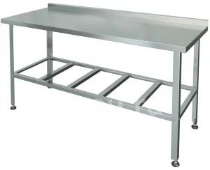 Стол производственный пристенный с бортом. Высота борта - 40 мм. Столешница - нержавеющая сталь AISI 430 толщиной 0,8 мм. усилена ЛДСП толщиной 16 мм. Ножки стола - оцинкованная сталь толщиной 1,5 мм. Полка-решетка из оцинкованной стали толщиной 0,8 мм. Регулируемые по высоте пластиковые опоры. Конструкция разборная. Максимальная равномерно распределенная нагрузка на столешницу - до 150 кг.