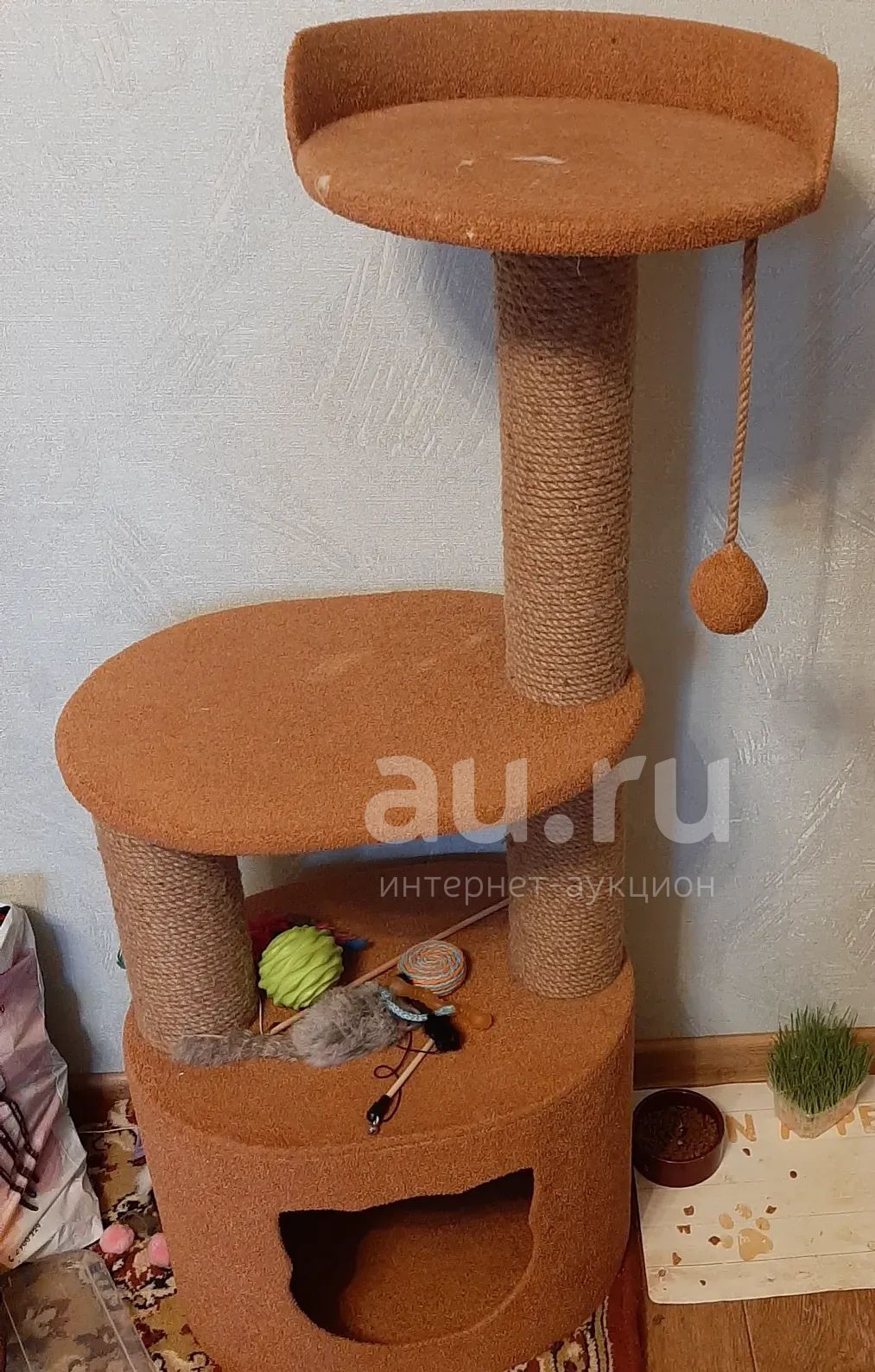 Покупали для нашего котенка новый в "Лапа моя". Оказался маловатым, т.к. у нас порода бенгал. Состояние хорошее, единственное верхняя лежанка подорвалась, она съемная, можно заказать новую 400 руб.