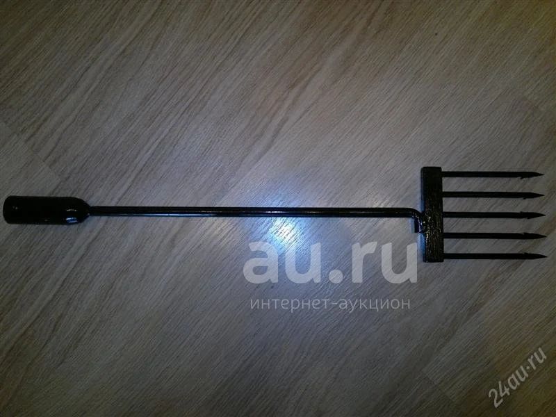 Острога изготовлена из пружинной стали 65Г.Тулейка под черенок 27 мм.Длина остроги 630 мм.Длина зуба 120 мм,диаметр 7 мм.Зубья завальцованы и проварены ( сверху )электросваркой.Ширина 100 мм.Расстояние между з зубьями 17 мм.