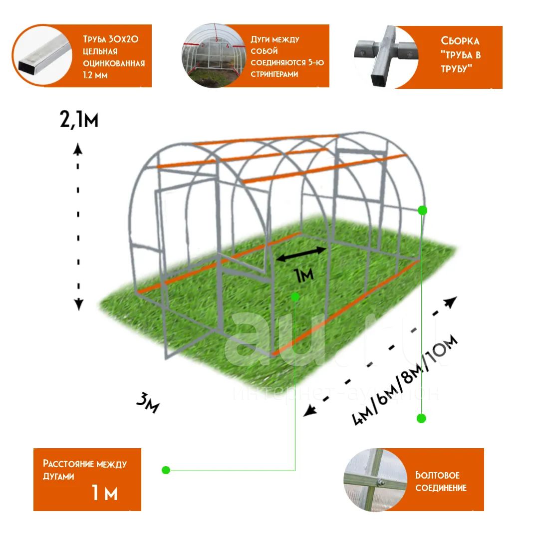 • арочная конструкция обеспечивает хорошее естественное освещение, без труда собирается и комплектуется дополнительными секциями.