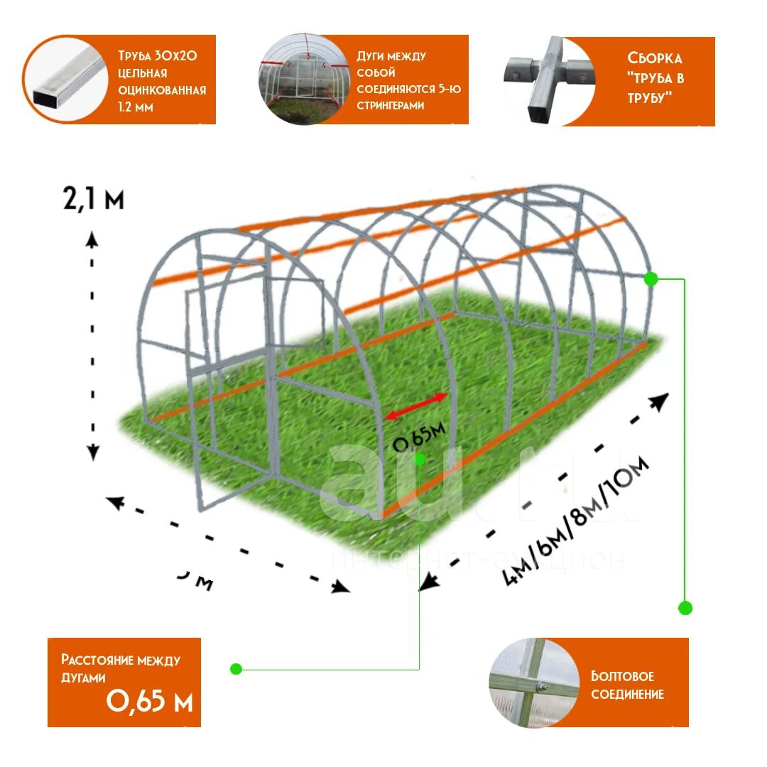 • арочная конструкция обеспечивает хорошее естественное освещение, без труда собирается и комплектуется дополнительными секциями,