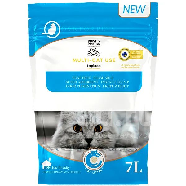 Organic Team Multi-cat Formula - высококачественный комкующийся растительный наполнитель из крахмала маниоки (тапиоки) с запатентованной формулой, полностью биоразлагаемый и безопасный, принцип комкования которого основан на уникальной гидрогелевой технологии.