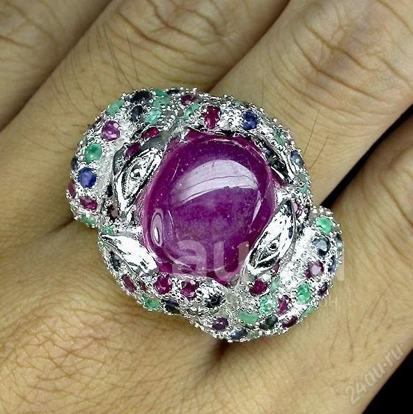 Великолепный, крупный дизайнерский перстень "Змеи" из стерлингового серебра 925 пробы с натуральными, природными рубином (16 на 13 мм), рубинами, сапфирами и изумрудами.