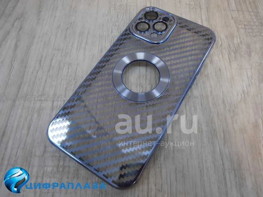 Чехол силиконовый iPhone 12 Pro под карбон с открытым лого и защитой камеры голубой