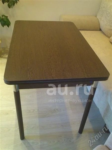 Кухонный стол с термостойким покрытием, темно-коричневого цвета, ширина - 70 см, высота - 75,5 см, длина - 110 см (в собранном виде) и 169,5 см (в разложенном виде).