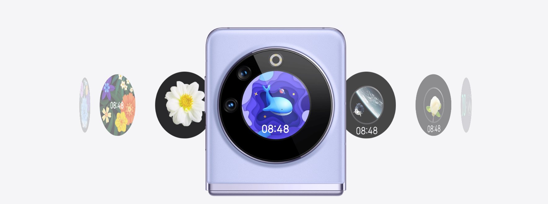 Космический дизайн внешнего дисплея с модулем камер напоминает планету со спутниками.