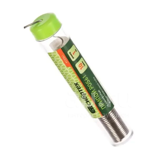 Припой с канифолью POS61 Сибртех 913361, диаметром 1 мм, весом 10 г, в пластмассовой тубе, — материал для пайки, в расплавленном состоянии соединяющий металлические детали. Содержит 39% свинца, олово и канифоль, не требует очистки припаиваемых поверхностей. Будет полезен для бытового ремонта радиоэлектронной аппаратуры.