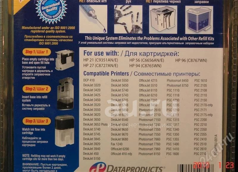 Автоматическая система заправки струйных картриджей HP DJ 3320-9680 и многих других (картриджи № 21, 27, 56, 94, 96) (Black) на 5 заправок. В магазинах такое вряд ли найдете. Руками почти делать ничего не надо. На фото есть инструкция (3 шага, включая наблюдение за процессом заправки). Качество чернил в этой системе лучше любых, распространенных на Российском рынке. Производство - США.