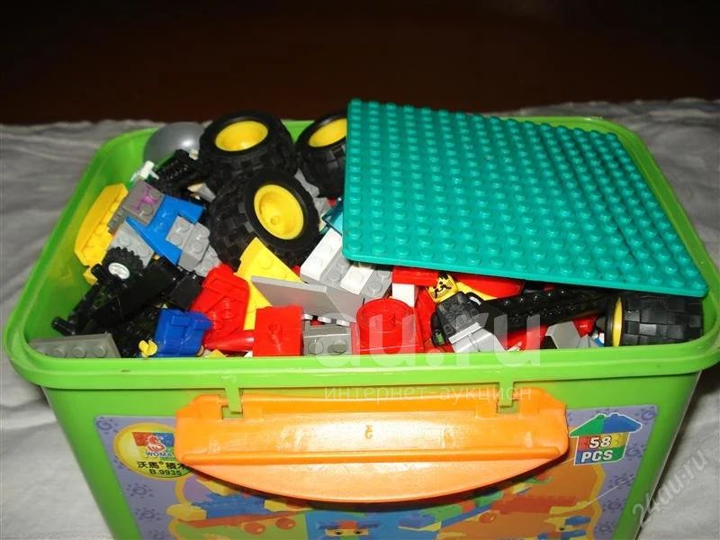 Много от разных наборов. Когда то были машинки, самолёты, мотоцикл и т.д. Продажа вместе с "Сундучком" размеры: высота 18,длина 23, ширина 15см. Некоторые детали могут быть в пластилине.