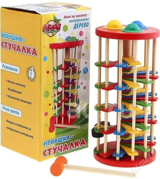 Деревянный лабиринт изобилует сложными поворотами трассы, шарики, по которым юный игрок должен ударять молоточком располагаются на самом верху башни. И шарики, и молоток достаточно большие по размеру, поэтому играть с ними будет удобно даже самым маленьким.