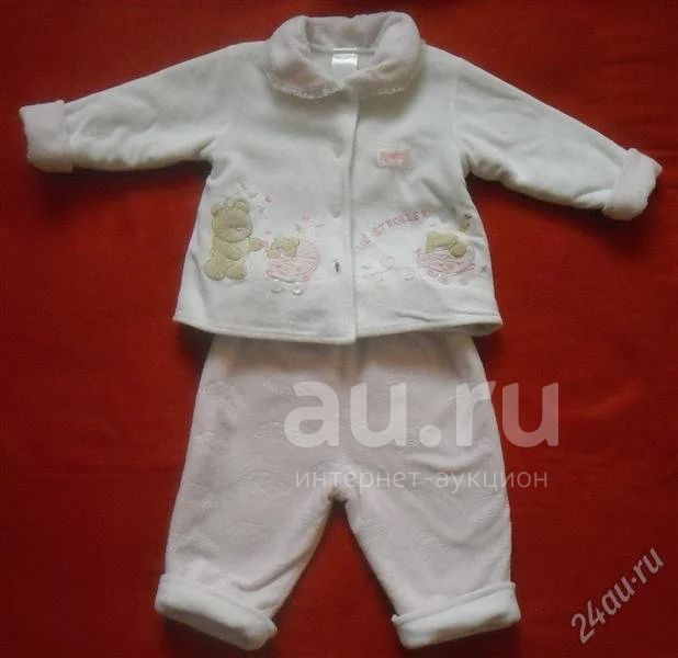 Костюм теплый, сверху ткань типа велюр, внутри флис. Кофточка белая, штанишки розовые. Мы носили до ростовки 80.
