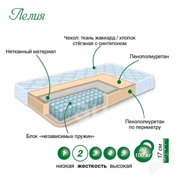 Применение пенополиуретана в качестве наполнителя делает матрас Лелия одним из самых недорогих в линейке матрасов на основе блока независимых пружин. Модель обладает хорошей поверхностной и объёмной упругостью.