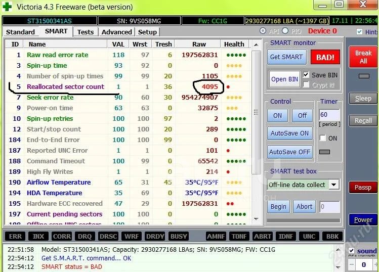 скриншот виктории прилагается. в один прекрасный день перестал определяться в винде, потом таинственным образом вернулся, решил слить часть файлов оттуда и отформатировал. 4к+ релоков + дохлый SMART.