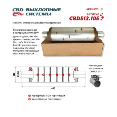 Артикул: CBD512.106, CBD512106 Тип внутреннего узла: 9-камерный секционный с 6-ю перфорированными и 2 диссипативными перегородками Параметры сечения изделия, мм: круг диаметром 120 Длина изделия, мм: 450 Длина камеры изделия, мм: 342 Выход/вход под трубу диаметром, мм: 50-55 Способ присоединения: под сварку или хомут Рекомендуем устанавливать с помощью хомута CBD-CLAMP CBD605.704 Материал: Нержавеющая сталь AISI 439 Вес брутто, кг: 2.924