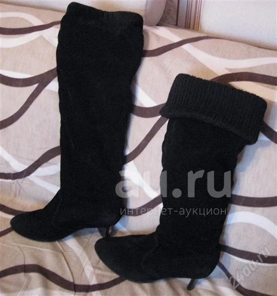 Замшевые черные с трикотажным манжетом сапоги,размер 37-38,высота 43,с отвернутым манжетом 28,высота каблука 6см.