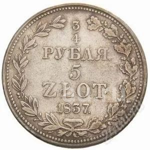 3/4 рубля - 5 злотых, 1837г, 11 перьев в хвосте орла