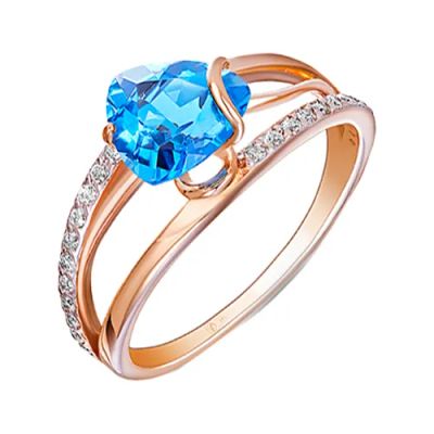 Золотое кольцо с London топазом и фианитами с родированием
