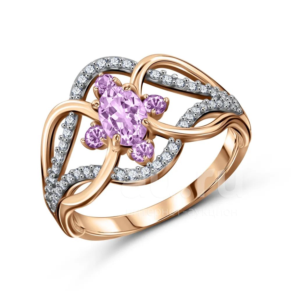 Золотое кольцо с аметистами и фианитами с родированием