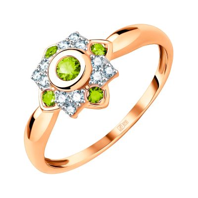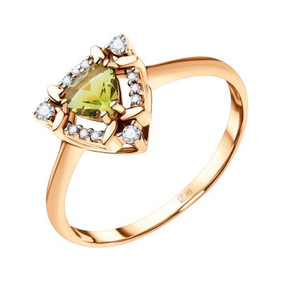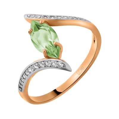 Золотое кольцо с хризолитом и фианитами с родированием