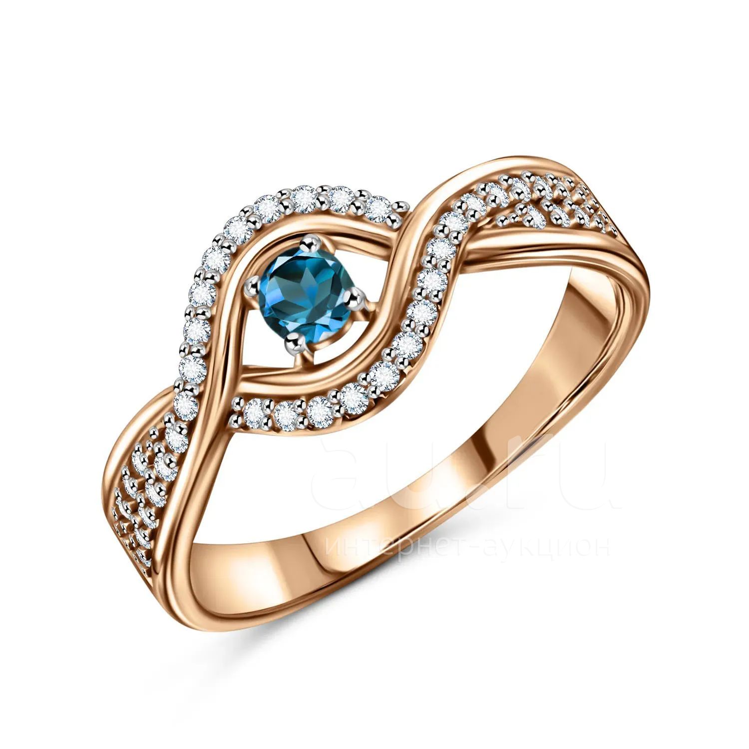 Золотое кольцо с London топазом и фианитами с родированием