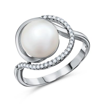 Серебряное кольцо с жемчугом и фианитами с родированием