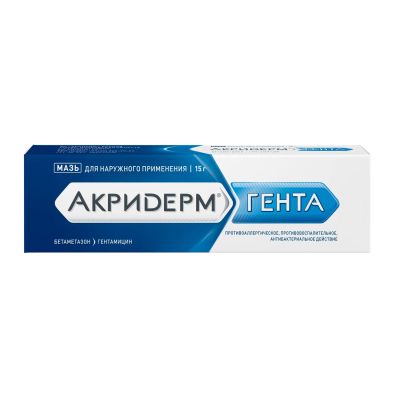 Мазь для наружного применения 0.05%+0.1% полупрозрачная, белого или почти белого цвета. АКРИДЕРМ ГЕНТА МАЗЬ ДЛЯ НАРУЖНОГО ПРИМЕНЕНИЯЛатинское названиеAkriderm GENTA...