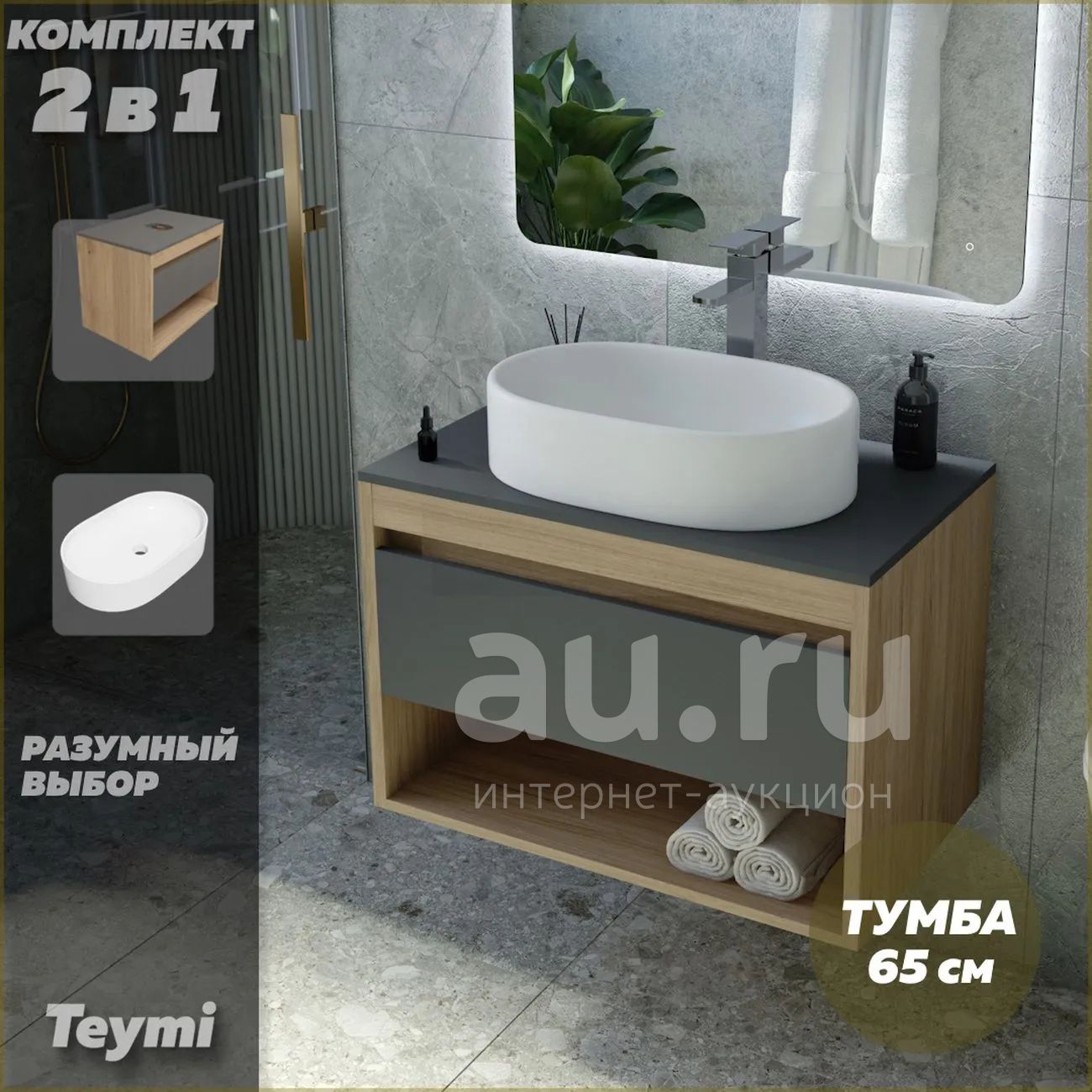 Тумба с раковиной Teymi Ritta, подвесная, 65 см, дуб Эврика/графит матовый (F03359)