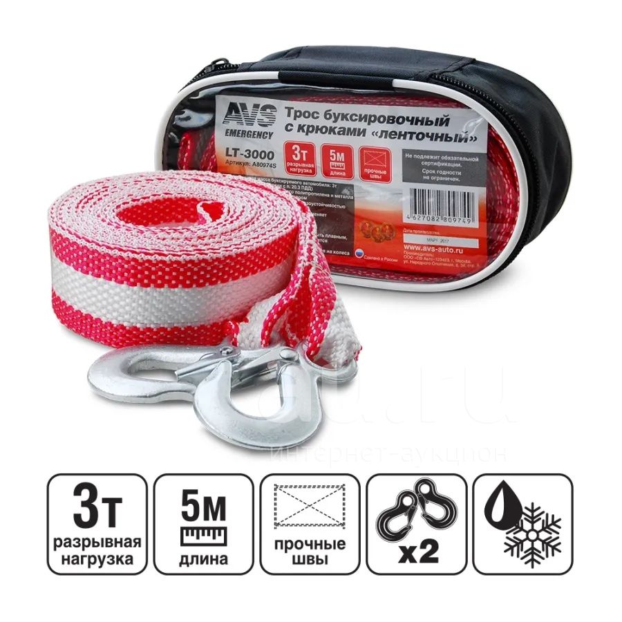 Трос буксировочный стропа 3 тонны 5 метров AVS LT-3000 с крюками
