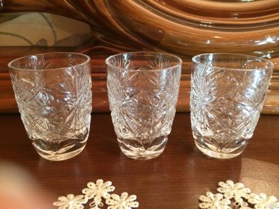 2 хрустальных стопки + 1 стеклянная. Высота 7 см, диаметр 4,5 см, объем 50 мл