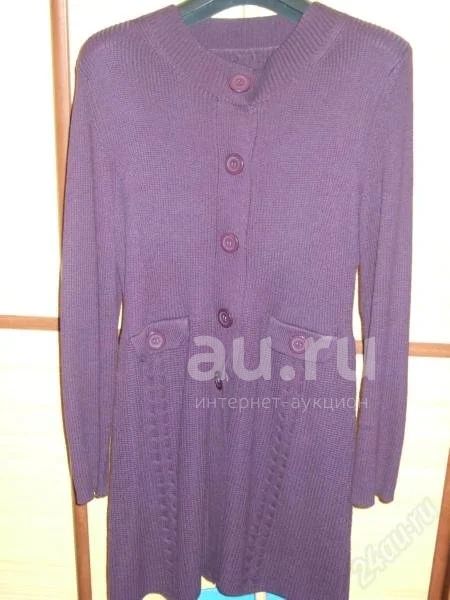 Кардиган сиреневый, вязка резинка, длина 85 см., застегивается на кнопки.