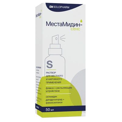 Фармакологическое действие МестаМидин-сенс обладает широким спектром антимикробного действия, фунгицидной и вирулицидной активностью за счет гидрофобного взаимодействия октенидина дигидрохлорида и феноксиэтанола с цитоплазматическими мембранами патогенных микроорганизмов. Спектр антимикробной активности охватывает споровую и аспорогенную микрофлору, грамположительные и грамотрицательные бактерии (аэробные и анаэробные), грибы рода дерматофитов и кандида, липофильные вирусы, микоплазмы, уреаплазмы. Резистентность при кратковременном или длительном применении МестаМидин-сенс не развивается. Препарат не оказывает токсического действия и практически не всасывается через слизистые оболочки, кожу и раневые поверхности, уничтожает микроорганизмы, не повреждая клетки тканей. Применение препарата способствует заживлению ран, ожогов. Лекарственное взаимодействие Не использовать совместно с йодсодержащими антисептиками из-за возможности выраженного изменения цвета кожи на смежных участках от коричневого до фиолетового. Если пациент применяет вышеперечисленные или другие лекарственные препараты (в т.ч. безрецептурные), перед применением препарата МестаМидин-сенс следует проконсультироваться с врачом.