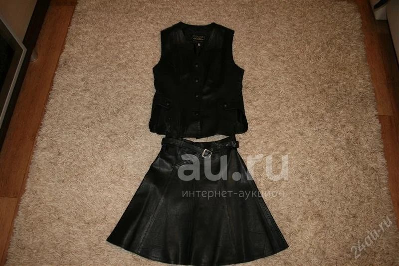 Костюм из натуральной кожи: юбка и жилетка.Состояние идеальное.Цвет - черный, размер 42-44.