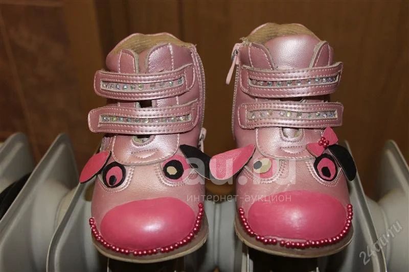 у одного ботиночка был сбит нос,заклеили иск.кожей,а потом и то ли коровки то ли щеночки получились,доче очень понравилось,жаль,что уже малы! аппликации выполнены из нат.и иск.кожы,держатся прочно!внутри ботиночки чистые!покупали больше 1000р