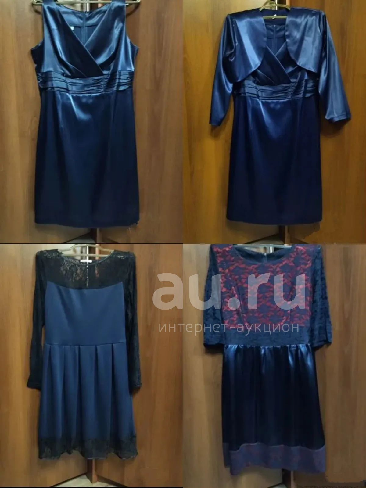 1. Костюм темно-синего цвета из атласа. Материал плотный. В комплект входят верх с рукавами 3/4 и платье. Размер указан 52 (XL), маломерит. Костюм новый, никто не носил.