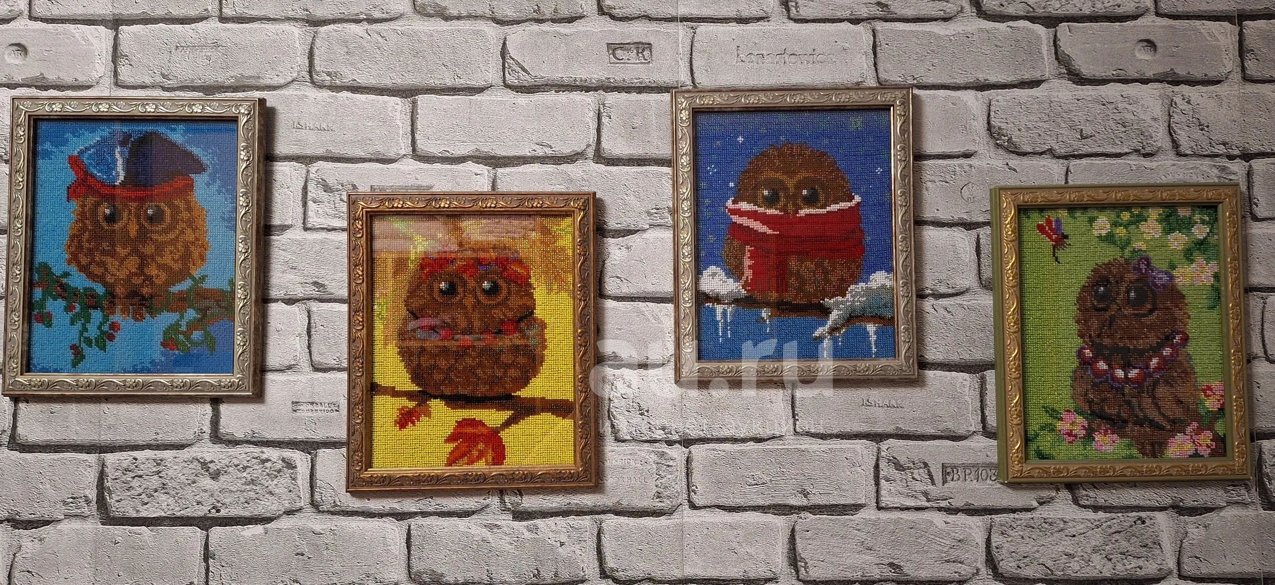 Четыре картины одним лотом. Сезонные совы: летняя, осенняя, весенняя, зимняя. Картины вышитые бисером, полная зашивка, Оформление было выполнено в багетной мастерской. Рамы со стеклом, одинакового дизайна, разные цветовые оттенки. Размер вышивки 19*24, размер картины в раме примерно 25*30, (не измеряла, но если нужны точные размеры - напишите).