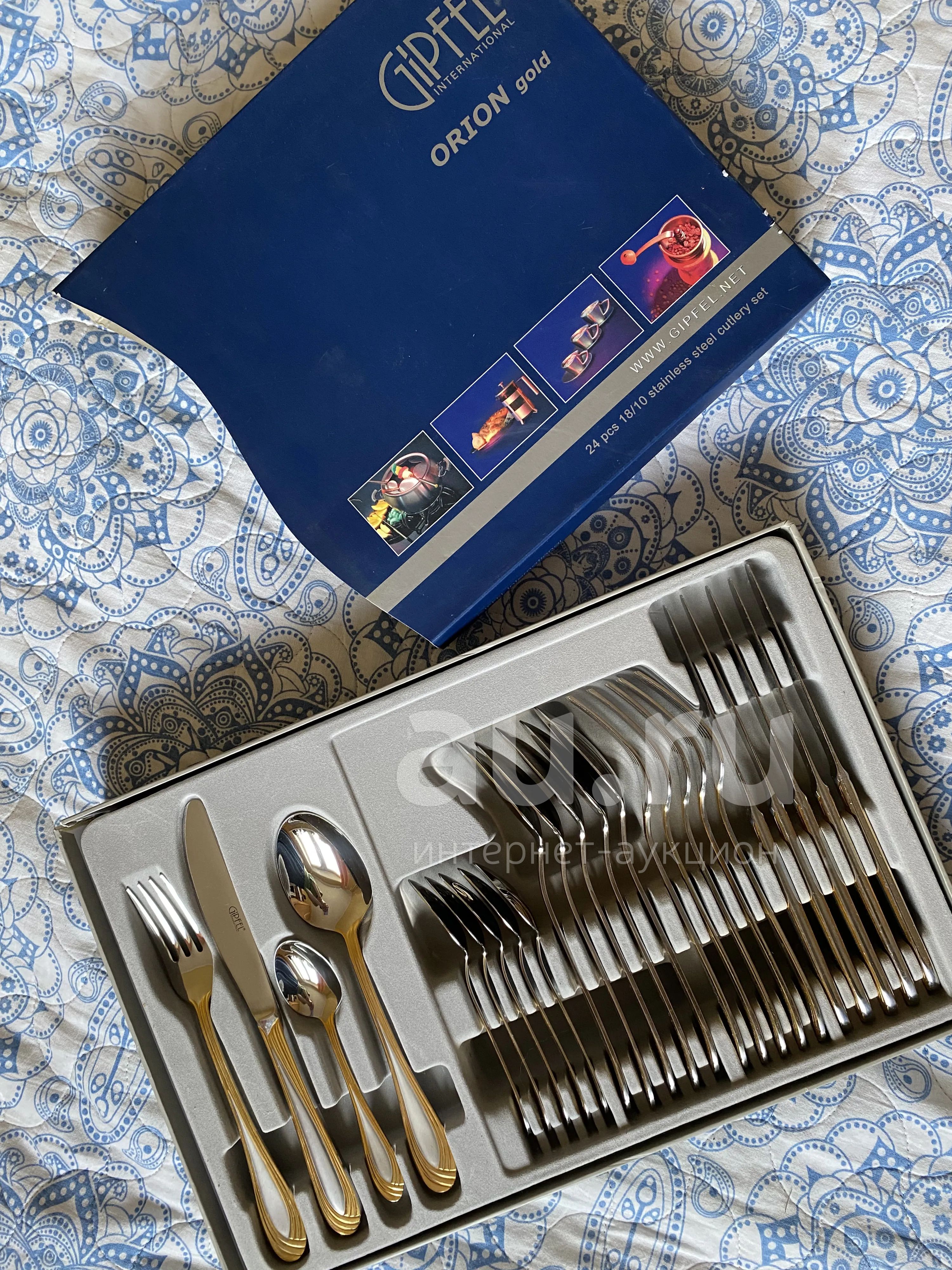 Набор столовых приборов, состояние нового, доставали один раз максимум, сохранилась полностью упаковка кроме индивидуальных пакетов для каждого прибора.