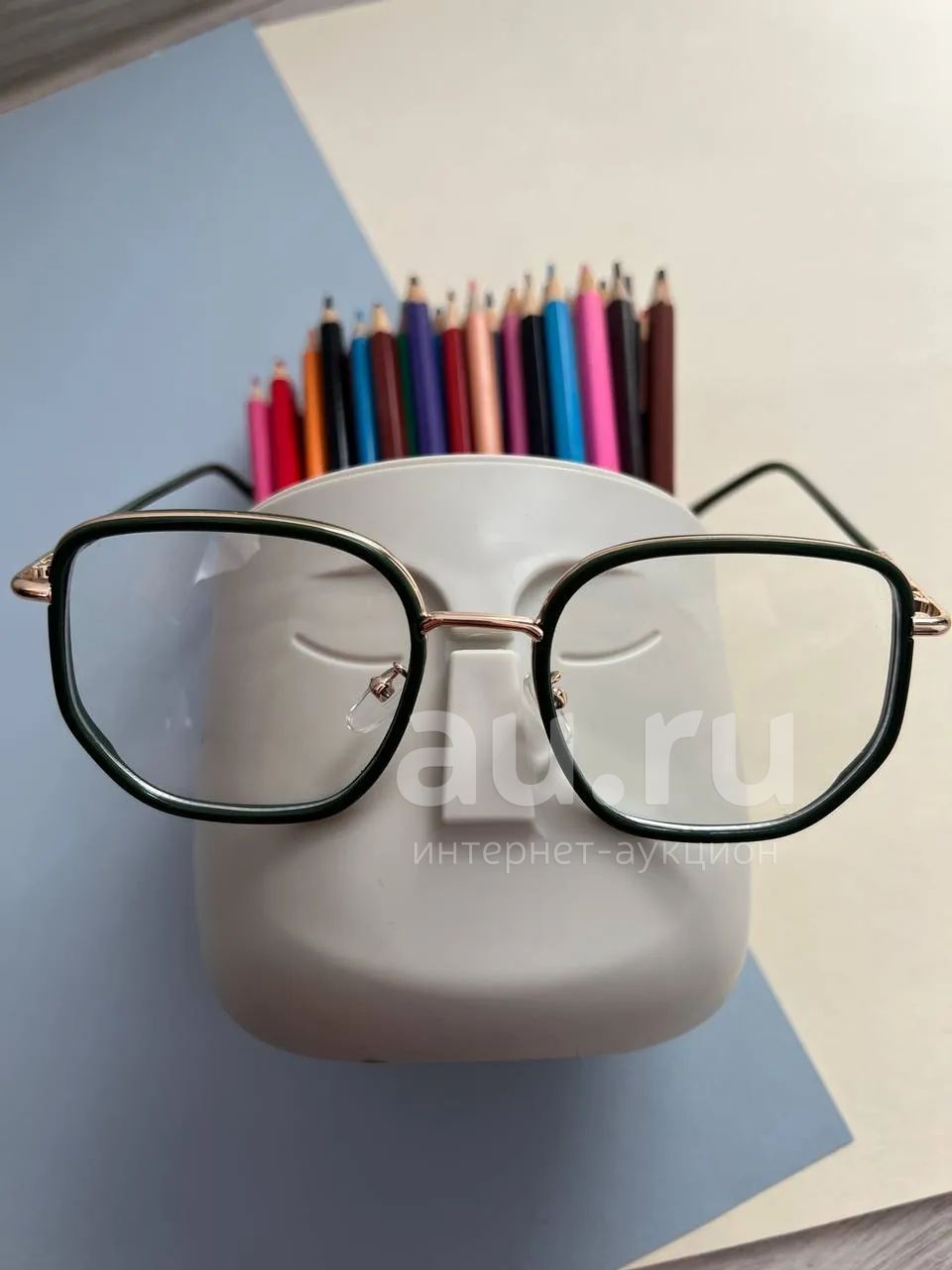 Очки как аксессуар к образу. Оправа темно-зеленая. Без диоптрий. Форма ближе к круглым, но с прямыми линиями. Интересные дужки с цветными полосками.
