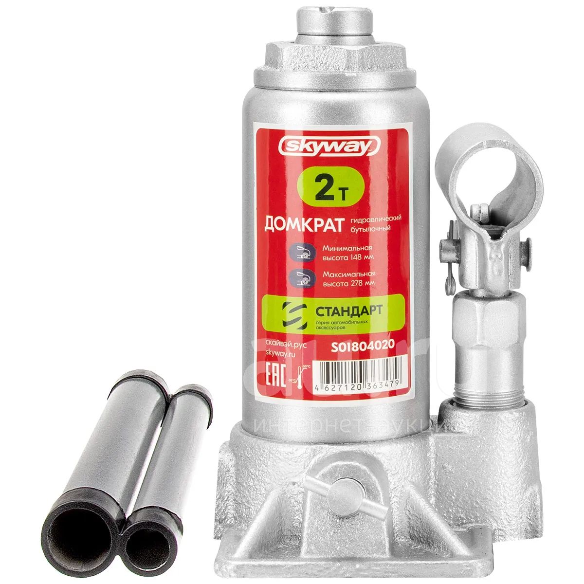Домкрат гидравлический бутылочный 2т h 148-278мм SKYWAY STANDART - необходимость заменить колесо может возникнуть в любую минуту, справиться с такой задачей и при этом затратить минимум собственных сил, поможет компактный и надежный гидравлический бутылочный домкрат SKYWAY. При небольших габаритах, он может поднять не только легковой автомобиль, но также и небольшой грузовой транспорт. Домкраты серии STANDART сочетают в себе простую и надежную конструкцию. Корпус и детали полностью металлические, что обеспечивает длительный срок безотказной службы по доступной цене.