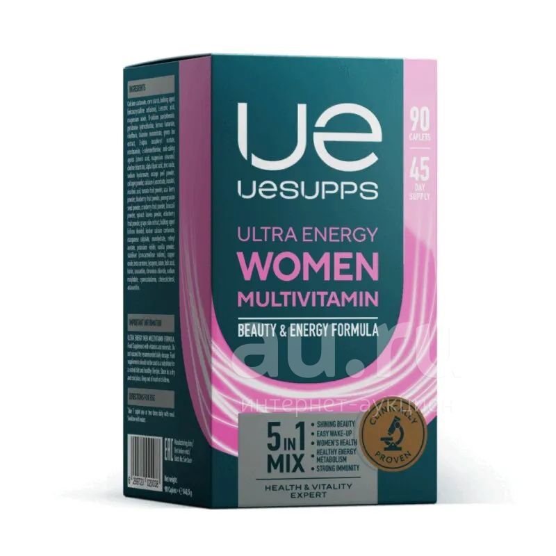 Комплекс витаминов для женщин Ultra Energy Women Multivitamin Formula разработан компанией UESUPPS специально для женщин. Этот суперкомплекс включает в себя более 50 наиболее важных для здоровья и женской красоты ингредиентов, которые обеспечивают баланс витаминов и микроэлементов, сглаживают влияние стрессов, наполняют энергией и жизненной силой. Продукт прекрасно подойдет жительницам мегаполиса, которые постоянно испытывают потребность в витаминах и минералах для легкого пробуждения, правильного метаболизма, стойкого иммунитета, женского здоровья и красоты. Упаковка включает в себя 60 или 90 каплет. Преимущества: - Витамины А, С, D3, Е, K1, В1, В2, В3 (ниацин), В5, В6,В7 (биотин), В9 (фолиевая кислота), В12 в составе комплекса системно оздоравливают женский организм и препятствуют возникновению дефицитов. - Ключевые микроэлементы цинк, магний, кальций, йод, хром, железо, кремний и другие повышают иммунитет, поддерживают нервную систему, улучшают память, внимание, состояние кожи и волос. - Экстракты фруктов, ягод и овощей замедляют процессы старения, снижают тягу к сладкому. - Гиалуроновая кислота и коллаген уменьшают износ суставов и связок, стимулируют сглаживание мелких морщин, возвращают коже тонус, упругость, увлажненность и эластичность. - Прием комплекса способствует общему улучшению самочувствия и настроения, здоровому режиму сна и чувству бодрости в течение дня. Показания к применению: Применяют в качестве биодобавки к пище - источника витаминов и минералов. Способ применения: Принимать по 1-2 каплете 1 раз в день после еды. Противопоказания: Индивидуальная непереносимость компонентов, беременность и кормление грудью. Перед применением рекомендуется проконсультироваться с врачом.